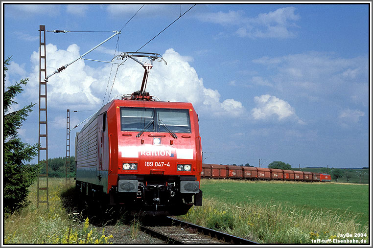 Nicht mehr weit bis in das Werk Hornberg bei Elbingerode. Im Schrittempo fahren die führende 189 047 und die 046 am 3.8.2004 am Fotografen vorbei.