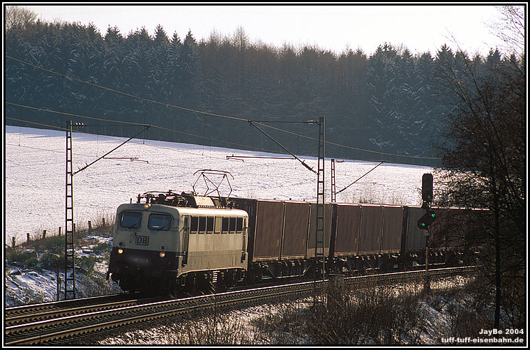 Fast exakt an der gleichen Stelle wie zuvor der Autotransportzug, ist im Februar 2004 die 140 713 unterwegs.