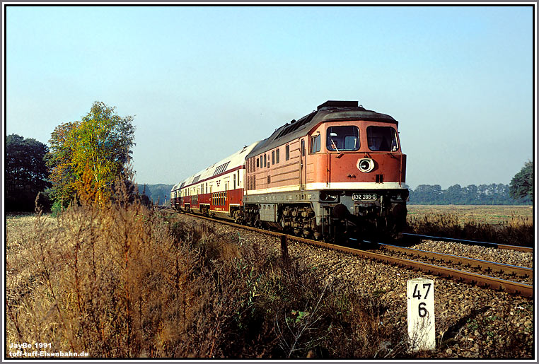 Dem Nebel der Börde entronnen, das gab die Gelegenheit die beiden Züge des Vortages nochmals in der Nähe von Groß Kreutz abzulichten. Den Zug nach Karlshorst führt am 22.10. die 132 289.
