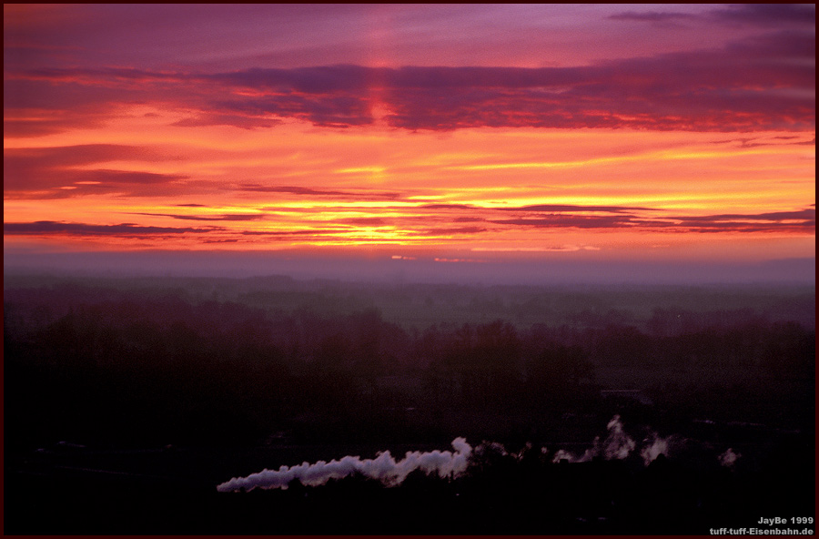 Eigentlich wollte ich im Februar 1999 in Brochterbeck nur den Sonnenuntergang über dem Münsterland fotografieren. Dass die Lengericher 50er von Saerbeck kommend das Bild bereichern würde, war reiner Zufall.