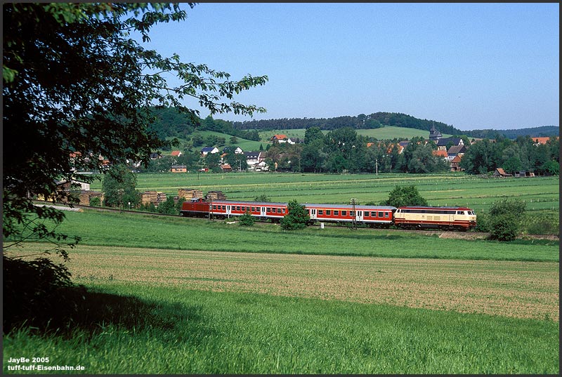 Der Affenfelsen in Form einer Wiese in Külte diente als erhöhter Fotostandort für 753 001 und 212 06´2 nach Kassel.